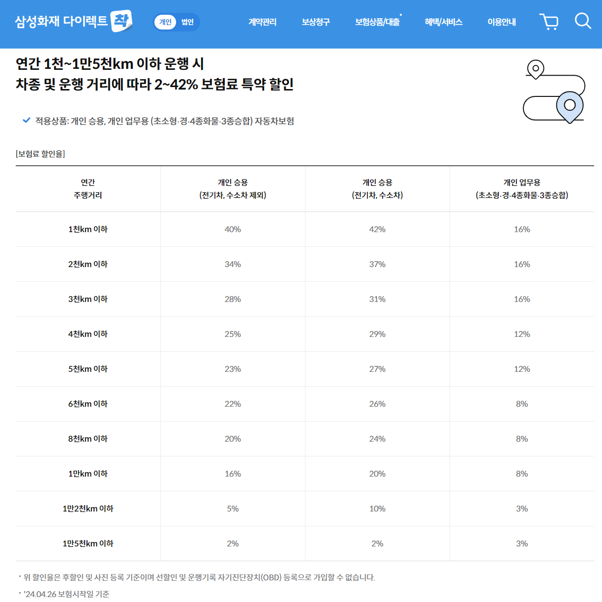 보험사별로 상이하지만 제가 사용하는 애니카 삼성화재의 주행거리 할인 기준은 아래와 같습니다.